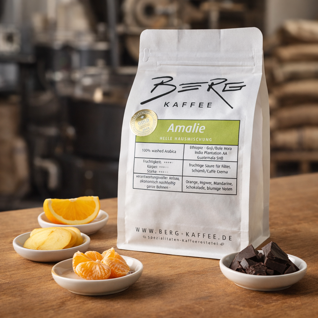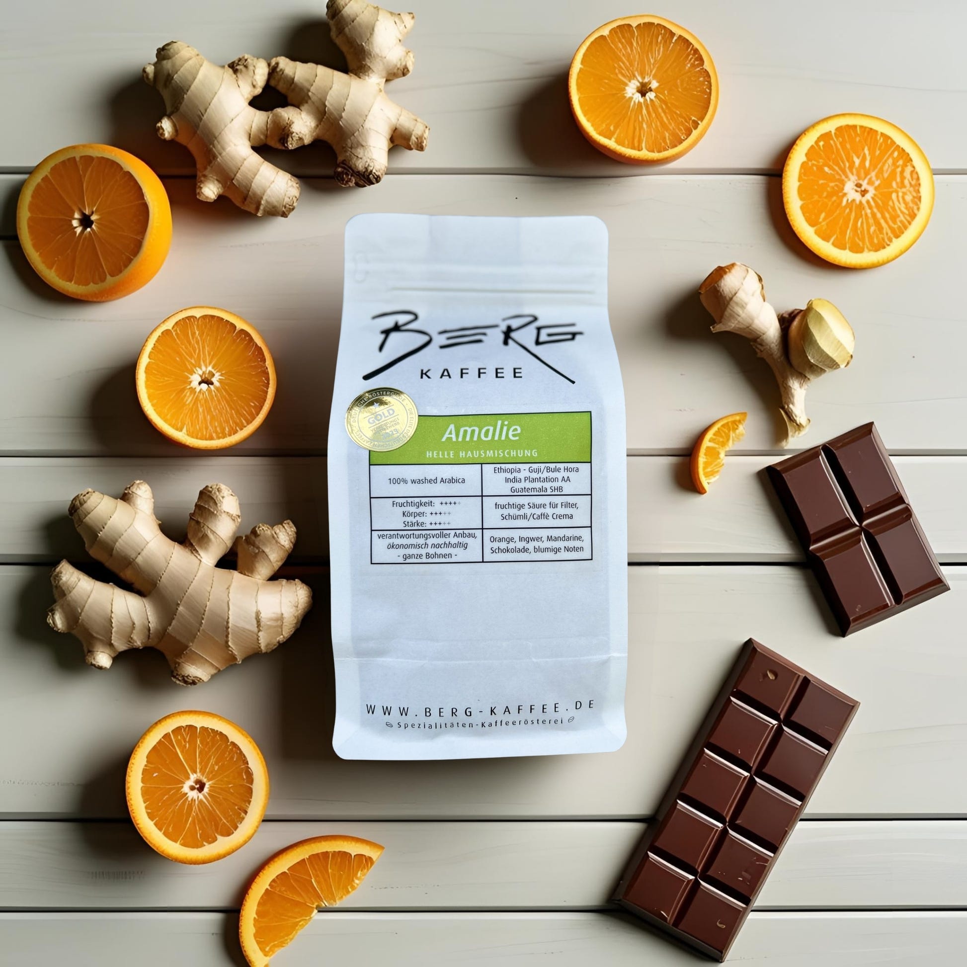 Frisch, fruchtig und klassisch zugleich: Die helle Hausmischung „Amalie“ vereint 100 % gewaschene Arabicas aus Mittelamerika, Afrika und Indien. Mit Noten von Orange, Ingwer, Mandarine und Schokolade richtet sich dieser ausgezeichnete Filterkaffee an alle, die komplexe Aromen und traditionelles Handaufguss-Flair lieben.