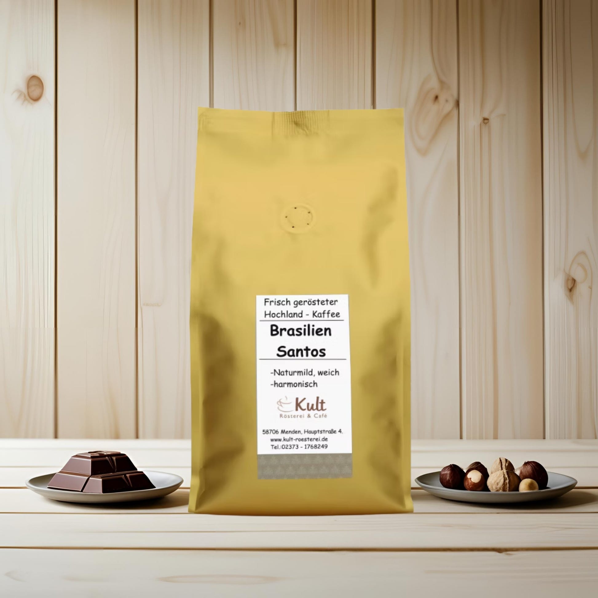 Der Brasilien Santos der Kult Rösterei überzeugt mit einem weichen, säurearmen Charakter und nussig-schokoladigen Aromen. Ideal für Genießer, die einen harmonischen Single-Origin-Kaffee aus Brasilien schätzen.
