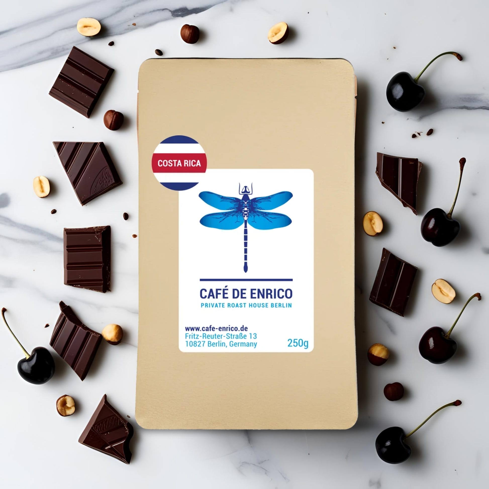 Dieser Espresso aus Costa Rica vereint nussig-schokoladige Aromen mit einem Hauch dunkler Kirsche. Die Arabica-Bohnen stammen aus mehreren Höhenlagen der Region Tarrazú und ergeben mit mittlerem Röstgrad (4 von 5) und moderater Intensität (3 von 5) einen ausgewogenen Kaffee für Liebhaber klassischer Espresso-Noten.