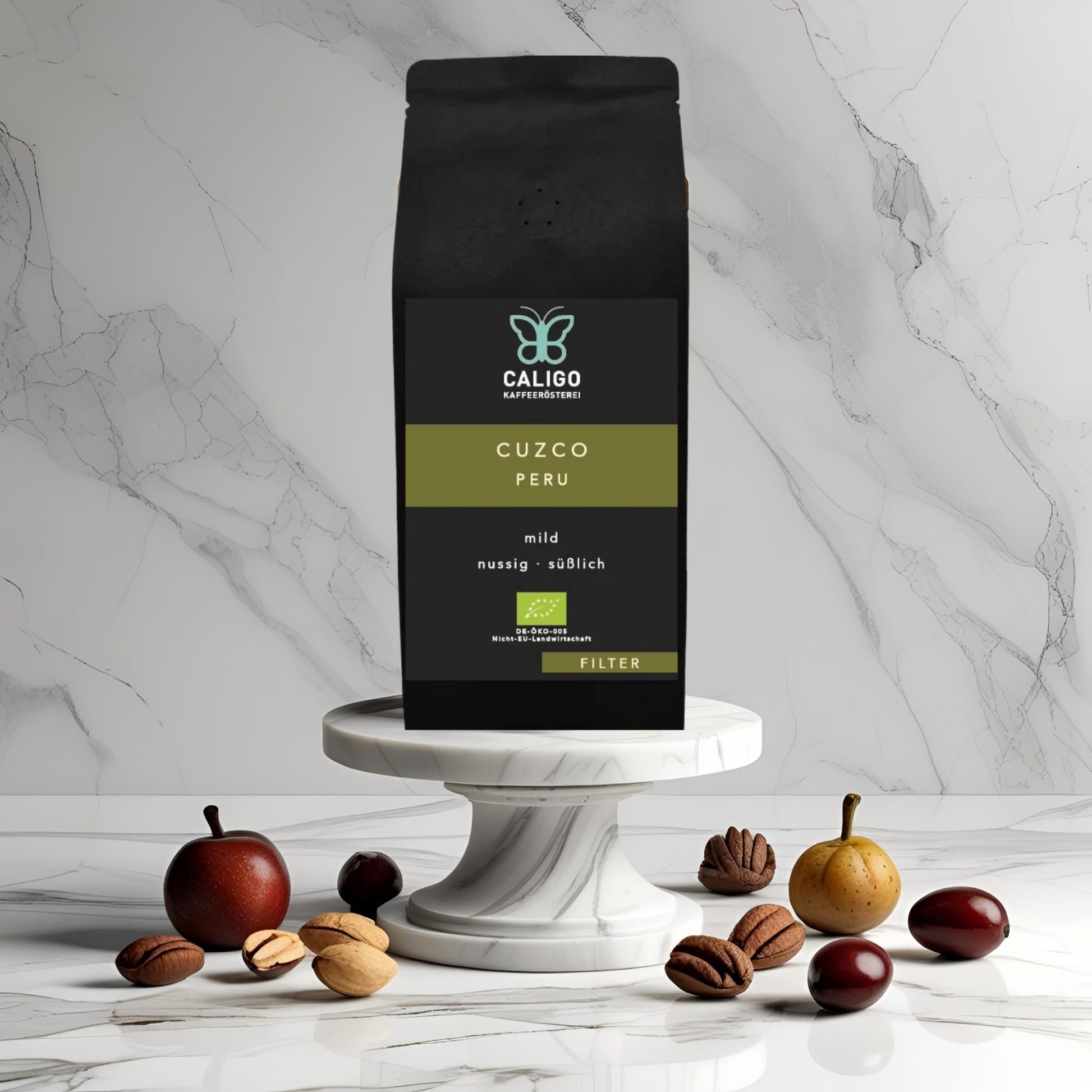 Der Cuzco Filterkaffee aus Peru vereint bio-zertifizierten Anbau, nachhaltige Handarbeit und die charakteristische Eleganz südamerikanischer Arabicas. Dieser ausgewogene Kaffee beeindruckt mit samtweicher Milde, nussigen Aromen und feinen Steinfruchtnoten – ein echter Genuss für alle, die Filterkaffee mit Herkunft und Charakter suchen.Beschreibung