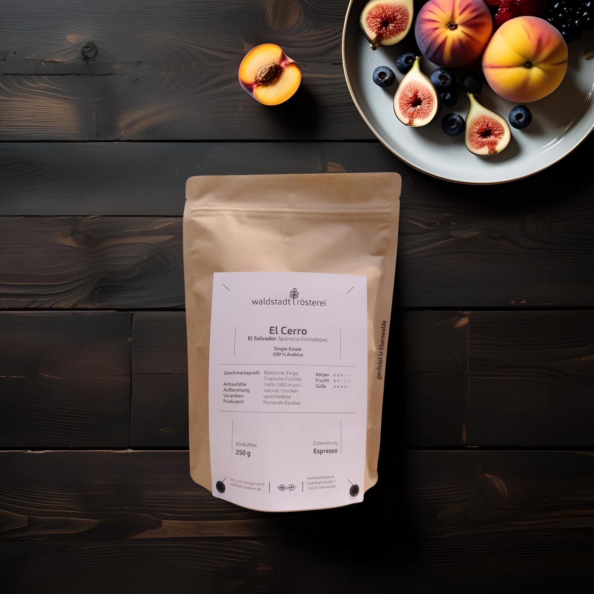Der El Cerro – El Salvador Espresso überzeugt als charaktervoller Single Estate-Kaffee mit dem typisch fruchtbetonten Profil mittelamerikanischer Arabicas. Seine Noten von Nektarine, Feige, Beeren und tropischen Früchten entfalten sich durch die schonende, natürliche Aufbereitung und die mittlere Espressoröstung besonders ausgewogen. Ideal für alle, die Espressi mit lebendigem Charakter und eleganter Süße schätzen.Beschreibung