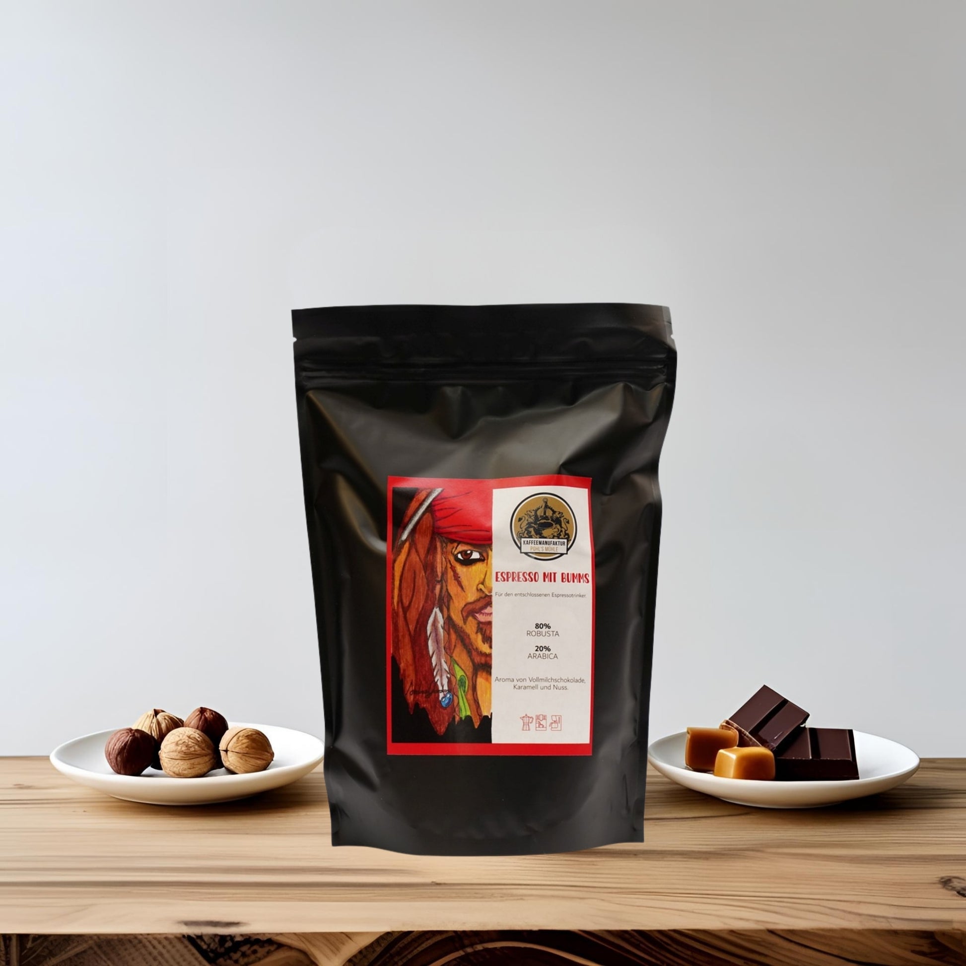 ... und hat ein Aroma von Vollmilchschokolade mit Karamell und Nuss. "Espresso mit Bumms" ist ideal geeignet für Vollautomaten und Siebträgermaschinen.