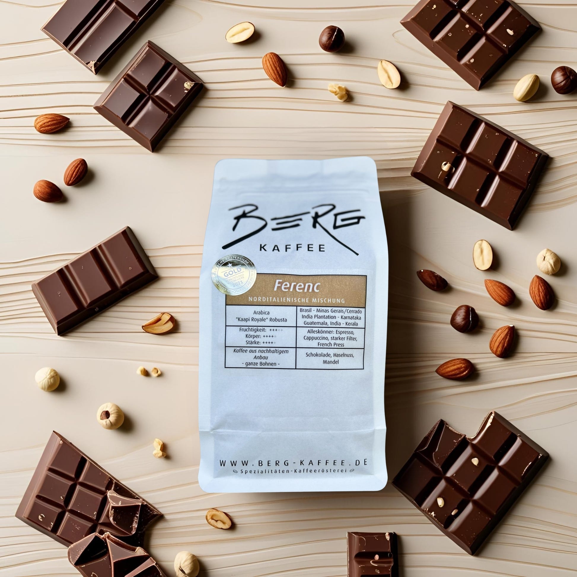 Kräftig, aromatisch und mit prämierter Qualität: Der Espresso-Blend „Ferenc“ vereint würzigen Edelrobusta mit vollmundigen Arabicas aus Süd- und Mittelamerika sowie Indien. Die mittlere Röstung bringt Noten von Schokolade, Haselnuss und Mandel zur Geltung – ein vielseitiger Allrounder für Espresso-Fans mit Anspruch.