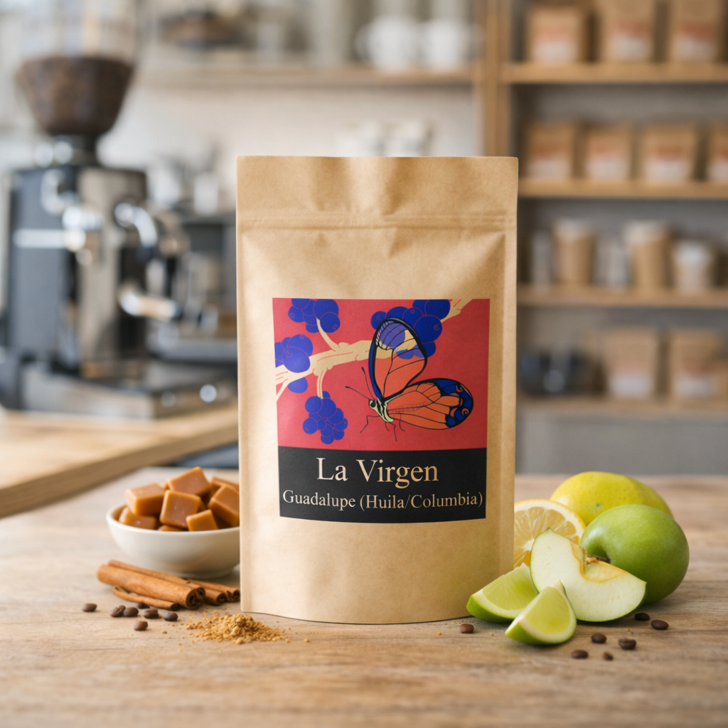 Kolumbien zählt zu den weltweit renommiertesten Kaffeeanbauländern – nicht zuletzt dank Regionen wie Huila, die für ihre Höhenlagen, fruchtbaren Böden und Mikroklimata bekannt sind. In der Gemeinde Guadalupe wachsen die Arabica-Varietäten Caturra, Colombia und Castillo auf 1.400 bis 1.900 Metern über dem Meeresspiegel. Die klimatischen Bedingungen mit kühlen Nächten und viel Feuchtigkeit fördern eine langsame Reifung der Kaffeekirschen, was komplexe Aromen und feine Säuren entstehen lässt. Typisch für Huila sind Kaffees mit ausgewogener Süße, klarer Struktur und fruchtigen Noten. Der „La Virgin“ ist ein gutes Beispiel dafür: Karamell und Zimt verbinden sich mit der Frische von grünem Apfel und Limone. Der Zusammenschluss kleiner Produzenten in Guadalupe unterstreicht den sozialen Stellenwert des Kaffeeanbaus für die Region. Ihre gemeinsame Vermarktung ermöglicht nicht nur bessere Preise, sondern hebt zugleich die Qualität ihrer Erzeugnisse hervor.