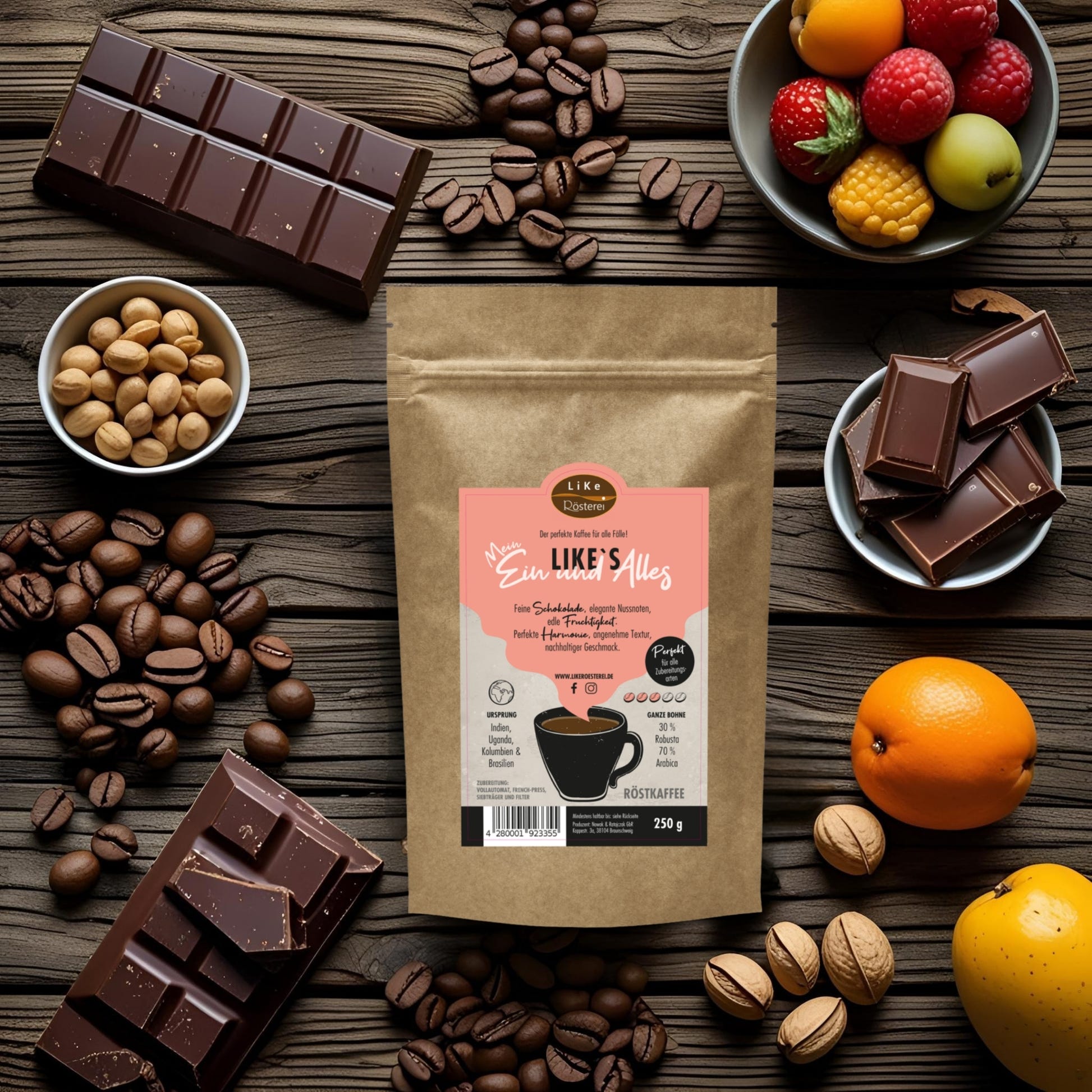 Die Bohnen für LIKE´S MEIN EIN UND ALLES stammen aus Brasilien, Indien, Kolumbien und Uganda – vier Regionen, die in der Kaffeewelt für ihre Vielfalt und Qualität bekannt sind. In Brasilien prägen sonnige Plantagen mit fruchtbaren Böden die nussig-schokoladigen Grundtöne. Indien bringt mit traditionellem Monsooning-Verfahren und reichhaltigen Böden eine würzige Komplexität ein. Kolumbien, mit seinen hochgelegenen Andenregionen und dem dortigen feucht-warmen Klima, steht für klare Fruchtigkeit und feine Säure. Uganda wiederum liefert aus seinen vulkanischen Böden einen kräftigen Körper und intensive Tiefe. Durch die Kombination dieser Ursprünge entsteht ein Blend, der die typischen Stärken der einzelnen Länder harmonisch vereint: schokoladige Wärme, elegante Nussigkeit und eine feine Frucht, die sich zu einem vollmundigen Gesamtbild zusammenfügen.