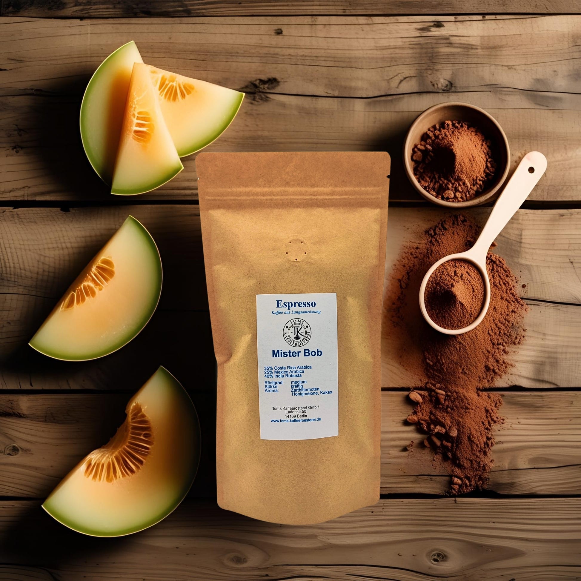Mit seinem kräftigen Profil und einem Röstgrad von 4 von 5 ist „Mister Bob“ ein klassischer Espresso-Blend, der durch seinen 40 % Robusta-Anteil eine besonders dichte Crema und viel Körper mitbringt. Die mittlere Intensität (3 von 5) und die eher geringe Säure machen ihn zur perfekten Wahl für Espresso-Liebhaber, die es rund und vollmundig mögen. Seine Noten von Kakao, Zartbitterschokolade und ein Hauch Honigmelone entfalten sich am besten im Siebträger oder Espressokocher – besonders lecker in Milchgetränken wie Cappuccino oder Latte Macchiato.