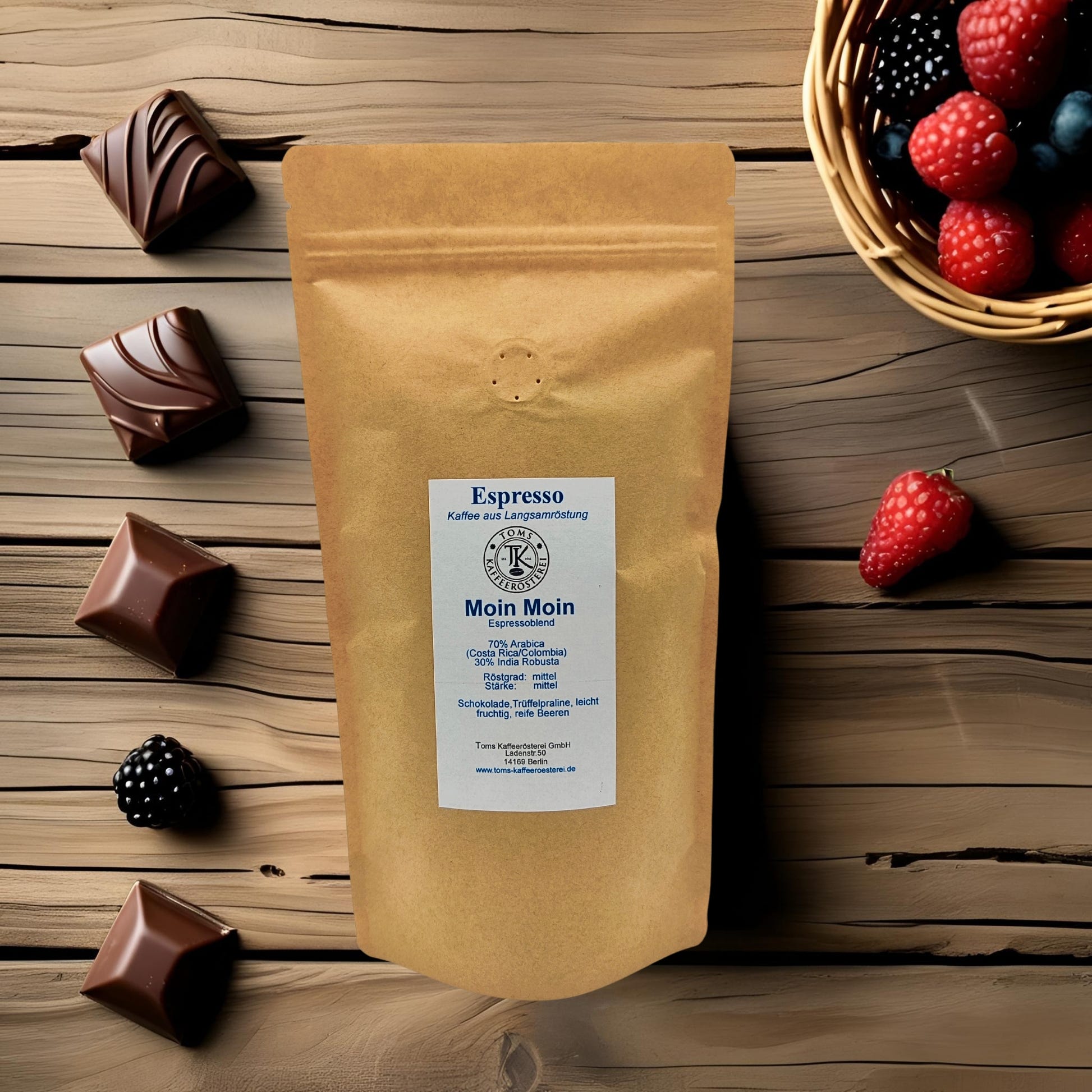 „Moin Moin“ ist ein ausgewogen gerösteter Espresso mit mittlerem Röstgrad (3 von 5) und milder Intensität (2 von 5). Die Kombination aus Arabica aus Kolumbien und Costa Rica sowie Robusta aus Indien sorgt für eine dichte Crema und ein fein abgestimmtes Geschmacksprofil mit Noten von Trüffelpraline, Beeren und einem Hauch Fruchtigkeit. Am besten kommt dieser Kaffee im Siebträger oder Vollautomaten zur Geltung, aber auch im Espressokocher entfaltet er seinen Charme. Ideal für einen cremigen Cappuccino oder als purer Genussmoment zwischendurch.