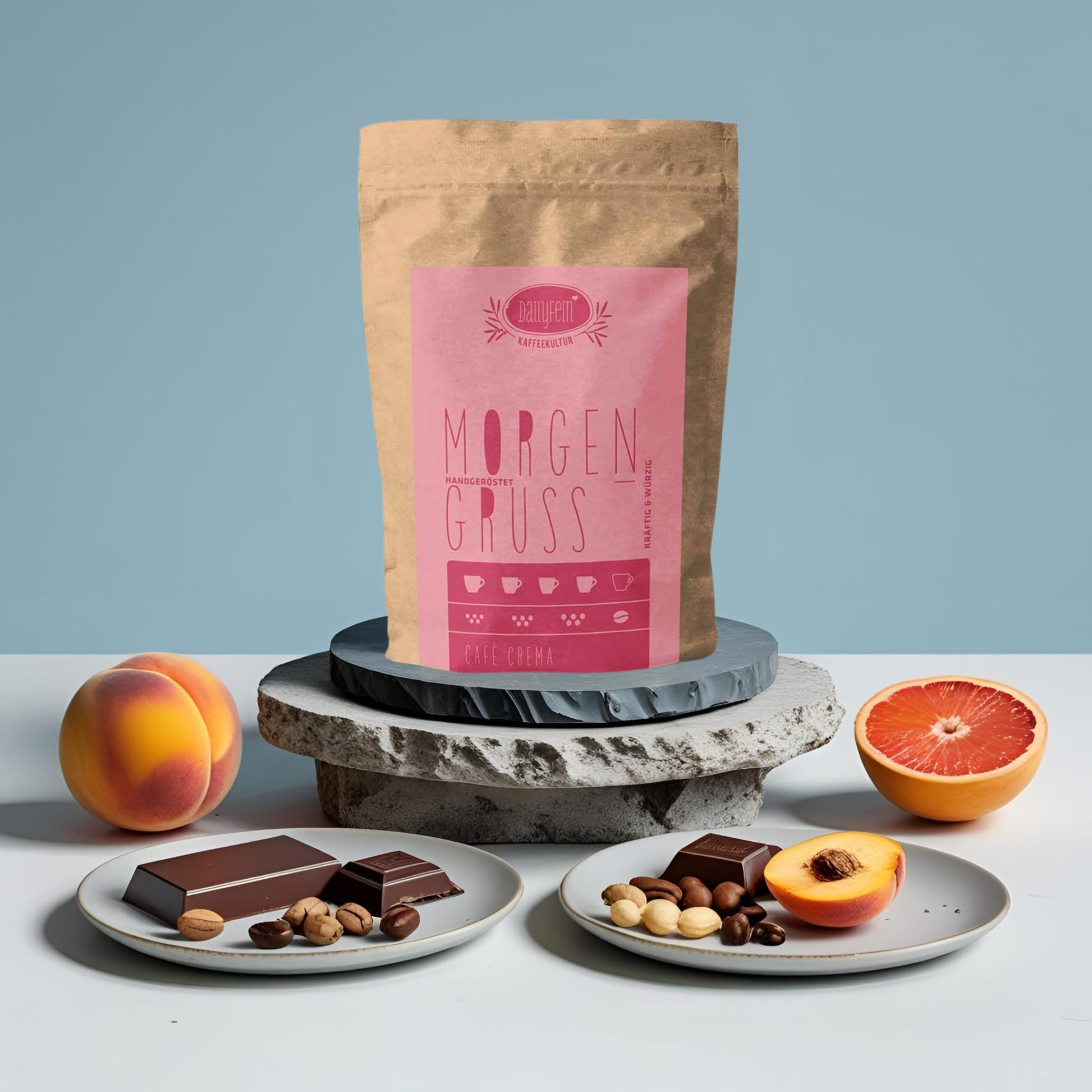 Morgengruss entfaltet sein volles Aroma als Café Crema – ideal zubereitet im Siebträger oder Vollautomaten. Mit einem Röstgrad von 4 von 5 entsteht eine reichhaltige Crema, die die schokoladigen und nussigen Noten aus Kolumbien betont. Die Intensität von 4 von 5 sorgt gleichzeitig für einen kräftigen Körper, während Pfirsich- und Grapefruit-Aromen aus Ruanda sowie feine Bergamotte- und Schwarztee-Töne aus Äthiopien für eine lebendige Fruchtsäure sorgen. Tipp: Brühen Sie bei 92–94 °C und probieren Sie den Morgengruss als Flat White oder Milchkaffee – er passt hervorragend zu dunkler Schokolade oder knackigen Nüssen.