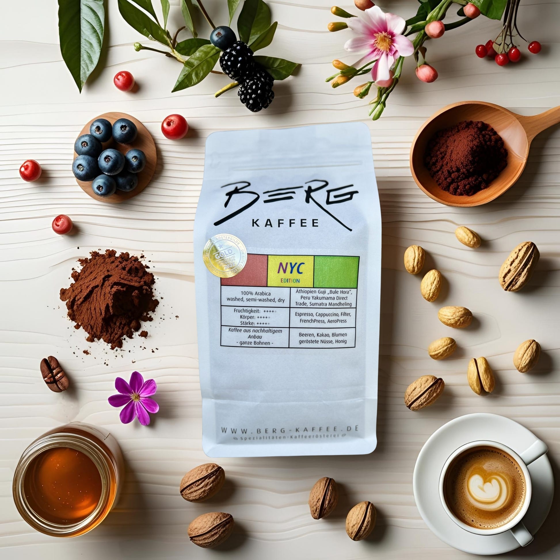 Unser neuer High-End-Blend „NYC Edition“ ist in verschiedenster Hinsicht eine besonders bunte Mischung, analog zur Bevölkerung der „Welthauptstadt“ New York. Die enthaltenen, handgepflückten und sonnengetrockneten Hochland-Arabicas stammen aus drei Kontinenten und vereinen die drei Hauptaufbereitungsarten „ungewaschen“, „halbgewaschen“ und „gewaschen“ in einer erstaunlich ausgewogenen, baristafreundlichen Mischung. Der weiche, cremige Kaffee mit haselnussbrauner Crema enthält Aromen von Blaubeere, gerösteten Mandeln und Kakaobohnen. Sowohl als markanter Espresso und durchsetzungsfähiger Cappuccino, als auch für French Press oder kräftigen Filterkaffee eignet sich diese Arabica-Mischung.