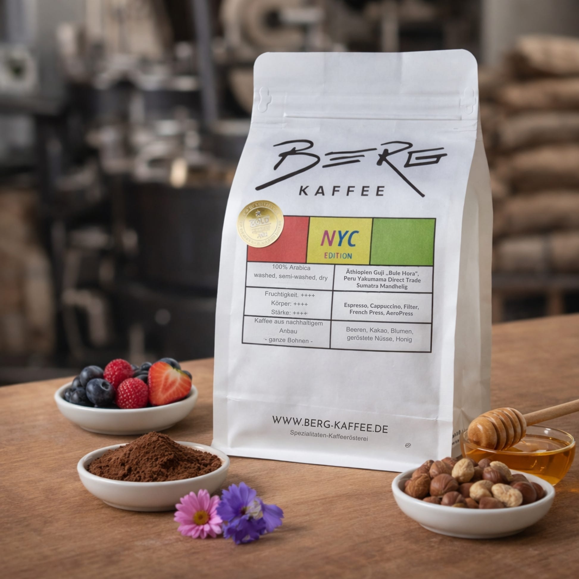Die Arabica-Bohnen für den NYC-Blend stammen aus Peru, Äthiopien und Indonesien – drei Ursprünge, die durch ihre geografische Vielfalt und ihre traditionsreiche Kaffeekultur für ein besonders harmonisches Geschmackserlebnis sorgen. In Peru wachsen die Bohnen in hohen Lagen der Anden, meist in kleinbäuerlichen Strukturen, wo sie von Hand gepflückt und überwiegend gewaschen aufbereitet werden. Das kühle Bergklima sorgt für langsame Reifung und feine, florale Tassenprofile. Aus Äthiopien, dem Ursprungsland des Kaffees, stammen wild wachsende Varietäten mit typisch beerigen, blumigen Aromen, die oft auf traditionelle Weise natürlich oder halbtrocken verarbeitet werden. In Indonesien, insbesondere auf Sumatra, entstehen durch die nasse Aufbereitung kräftige, würzige Noten mit einer erdigen Tiefe. Die Kombination dieser drei Herkunftsländer im NYC-Blend bringt Fruchtigkeit, Tiefe und Komplexität perfekt ins Gleichgewicht – ein globaler Kaffee mit ausgewogenem Körper und Charakter.