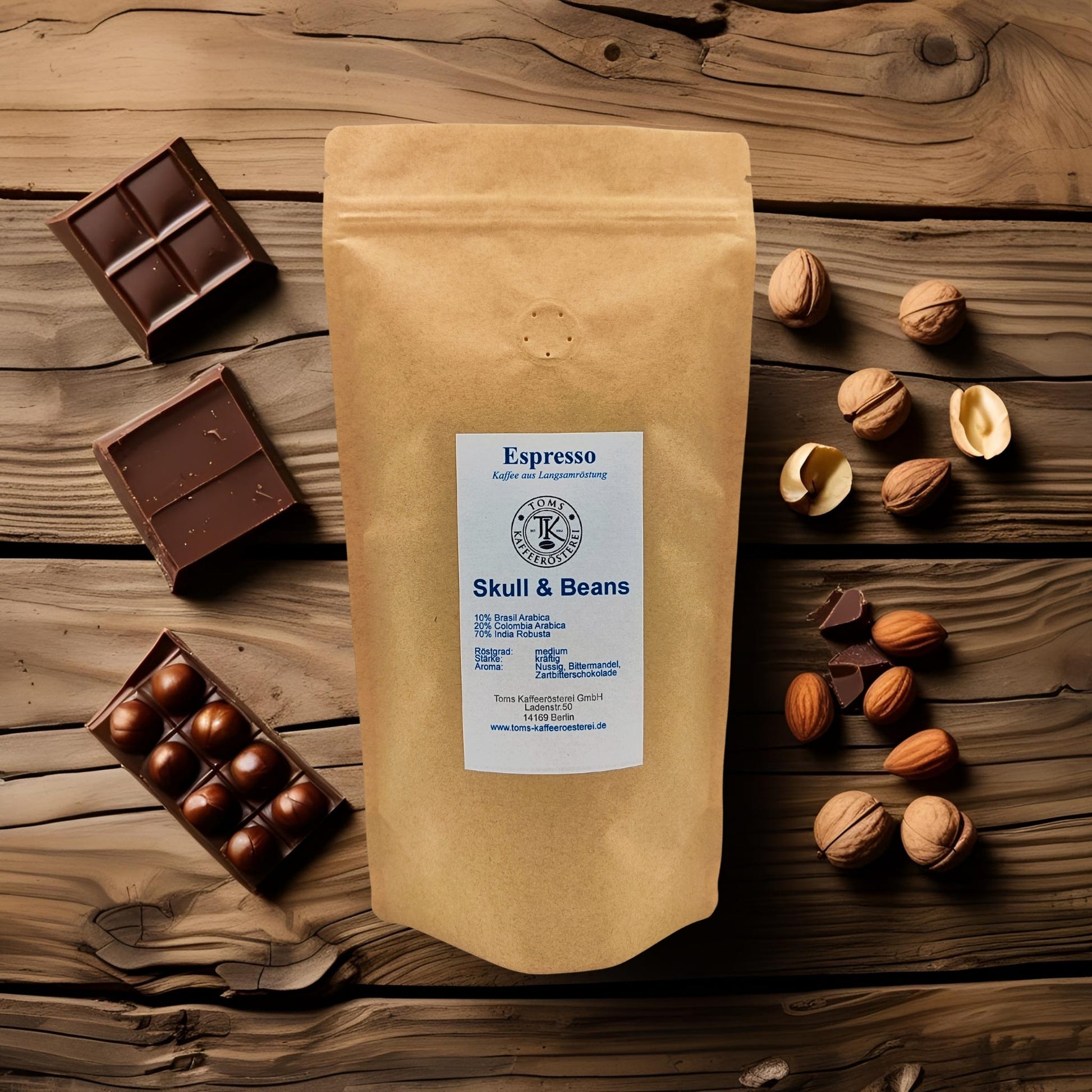Ein Kaffee mit Ansage: Skull n' Beans vereint 70 % kräftigen Robusta aus Indien mit 30 % aromatischem Arabica aus Brasilien und Kolumbien – und liefert so einen intensiven Espresso-Blend mit Charakter. Für alle, die es gerne stark, würzig und italienisch mögen.Beschreibung