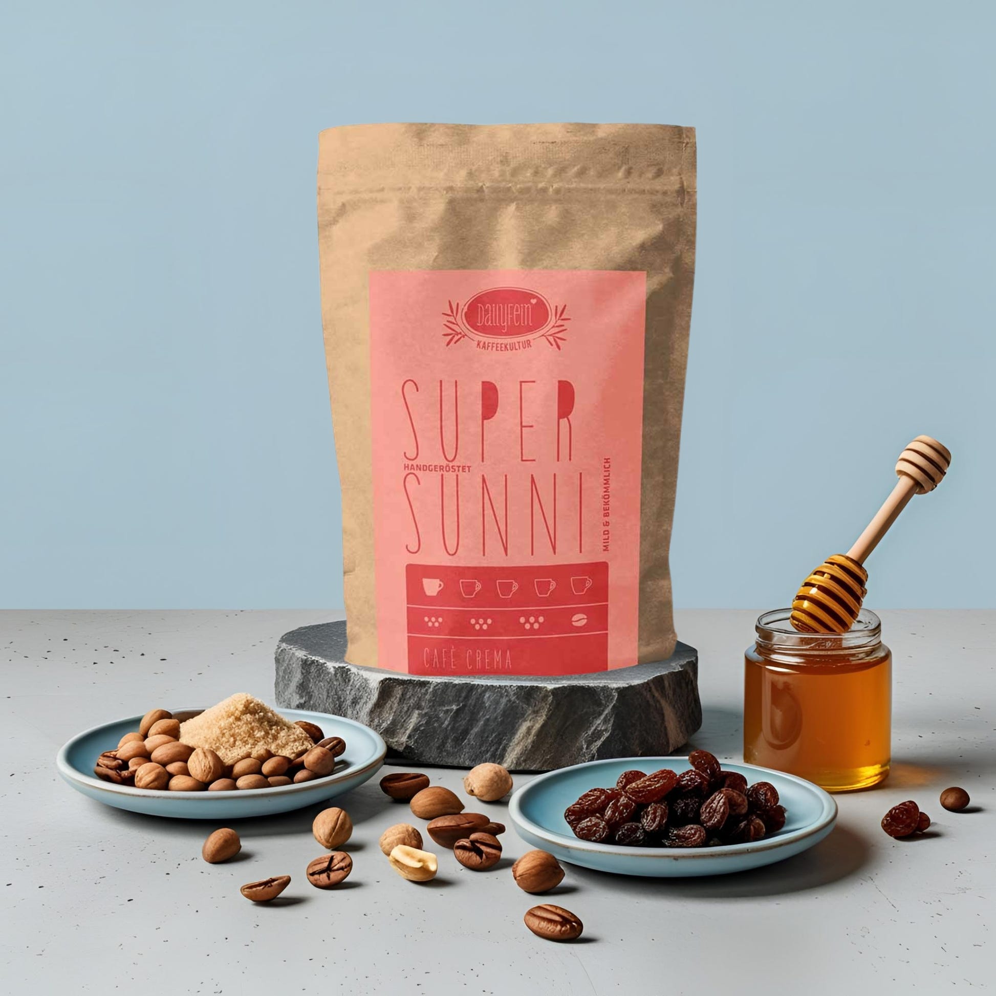 SuperSunni ist ein angenehm milder Blend aus 100% Arabica-Bohnen aus Brasilien, Honduras und Peru. Mit seiner leichten Röstung (1 von 5) und sehr niedrigen Intensität (1 von 5) ist dieser Kaffee besonders säurearm und aromatisch. Die ausgewogene Mischung vereint Noten von braunem Zucker, Nuss, Rosine und Honig zu einem harmonischen Geschmackserlebnis, das perfekt für den täglichen Kaffeegenuss geeignet ist.Beschreibung