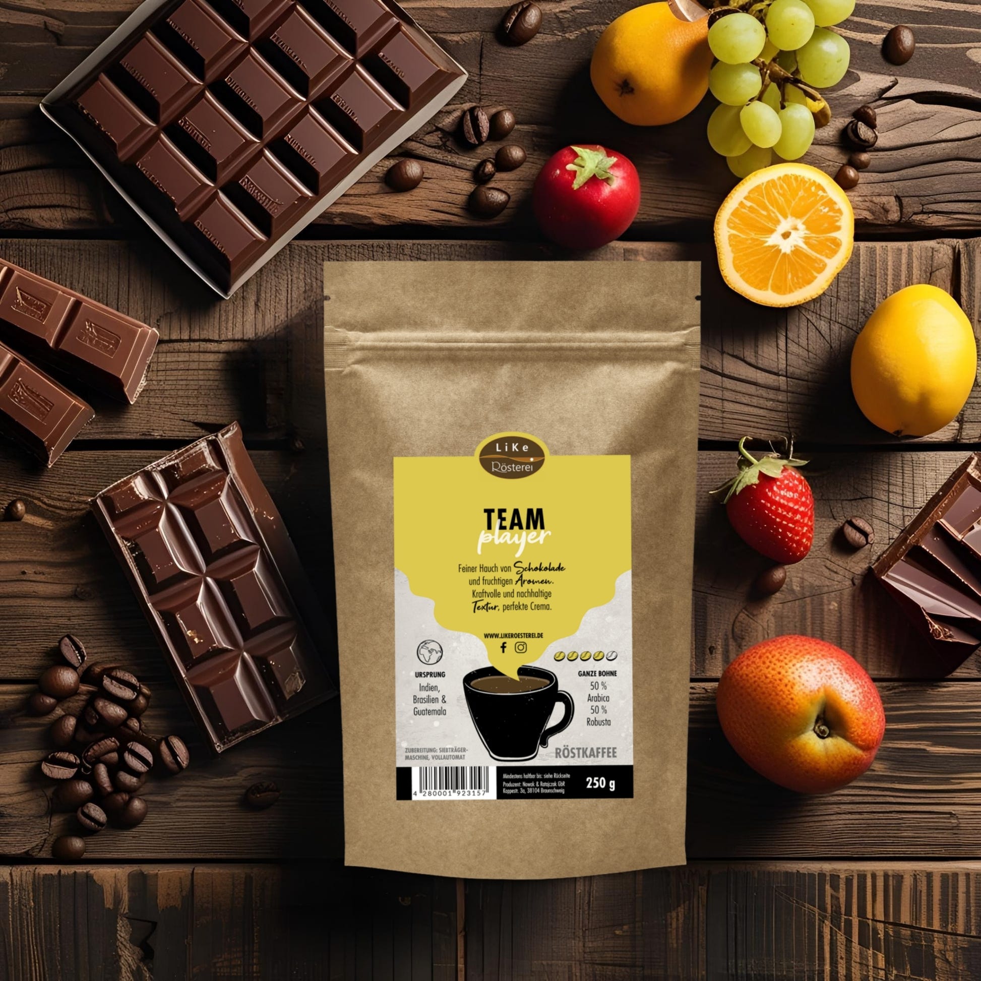 Der Espresso-Blend TEAM PLAYER der LiKe Rösterei vereint 50 % Robusta und 50 % Arabica zu einem intensiven Kaffee mit Noten von Schokolade und fruchtigen Aromen. Mit seiner kräftigen Textur und perfekten Crema ist er ein vielseitiger Begleiter für alle, die eine vollmundige Tasse mit ausgewogener Tiefe schätzen.Beschreibung